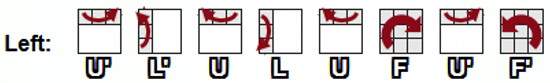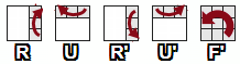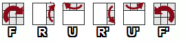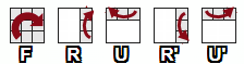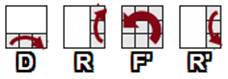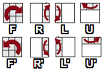 Прописными буквами F, R, L, U, D обозначаются элементарные операции поворота соответствующей грани (слоя, ломтика) куба на 90° по часовой стрелке. Обозначения F’, R’, L’, U’, D’ соответствуют повороту граней на 90° против часовой стрелки.